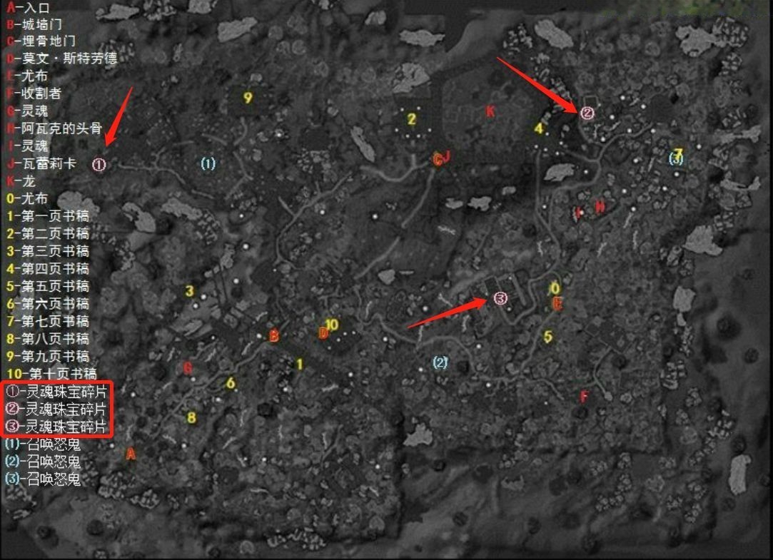 首頁 上古捲軸5:天際 問答 上古捲軸5:天際收割者三個碎片位置在哪? 2022-12-25 在靈魂石冢里收集到三顆收割者寶石碎片後,然後到收割者宮殿召喚收割者。以下為靈魂石冢大地圖,天際收割者三個碎片位置如下(紅色箭頭指向處)。