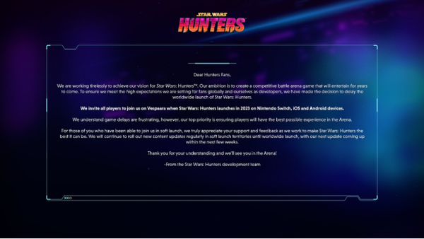 開發商說道:「我們正在不知疲倦的工作,以實現我們對《星球大戰:獵人》的願景。我們的目標是創造一款具有競爭力的戰斗競技場游戲。為了確保滿足全球粉絲和我們開發者的最高期望,因此現在將推遲《星球大戰:獵人》的全球發行時間」。