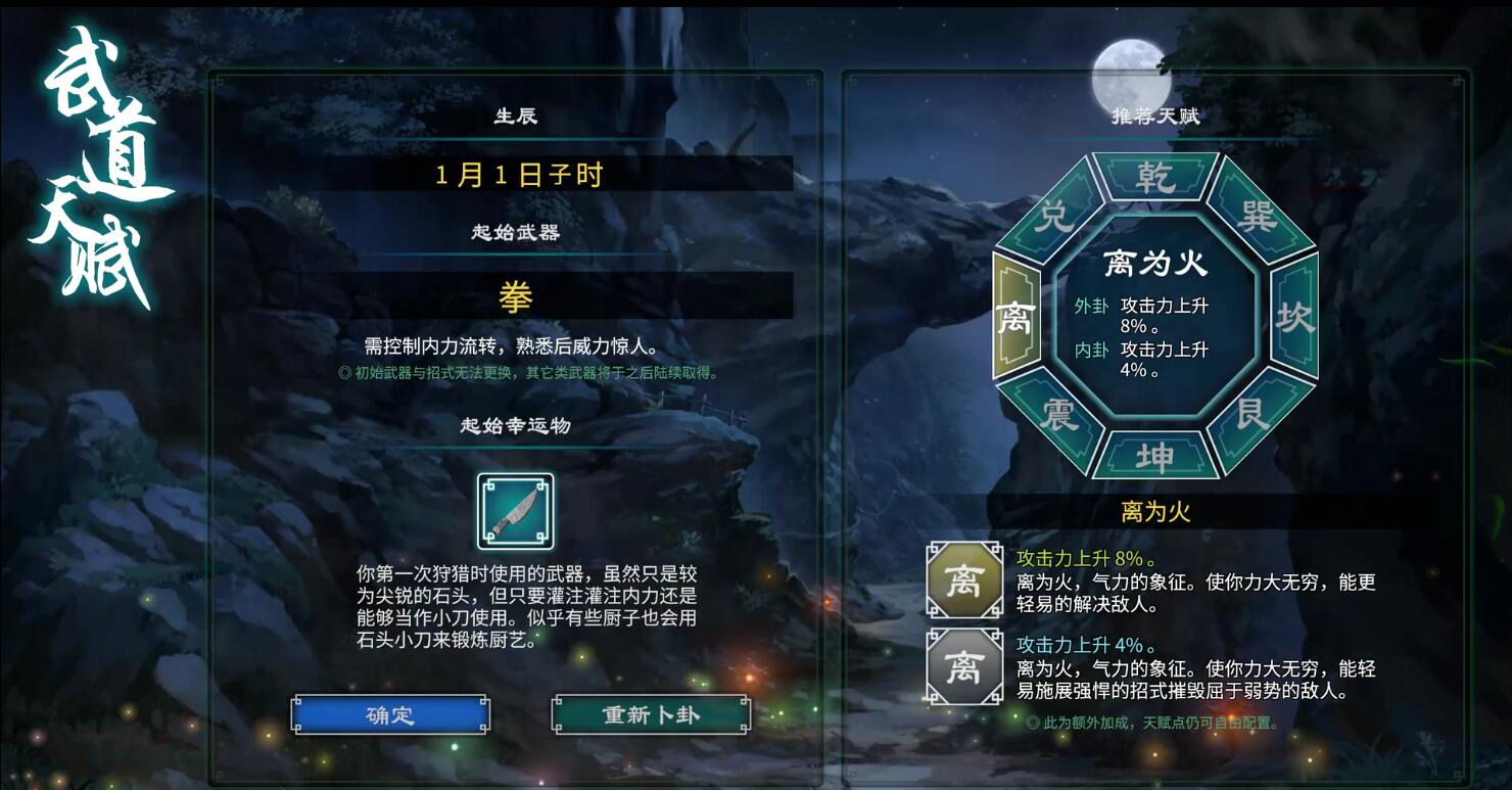 首頁 天命奇禦2 問答 天命奇御2生辰怎麼選? 2022-12-26 日期方面,決定起始幸運物,選擇1月1日子時。接下來選擇「對拳用木人樁(小型)」。這裡選擇「下次要多分我一點糖」。選擇馬上戴起面具。選擇去向村長道別。這樣選擇的話,屬性「離為火」是必出的,是目前初始時候攻最高的選擇。