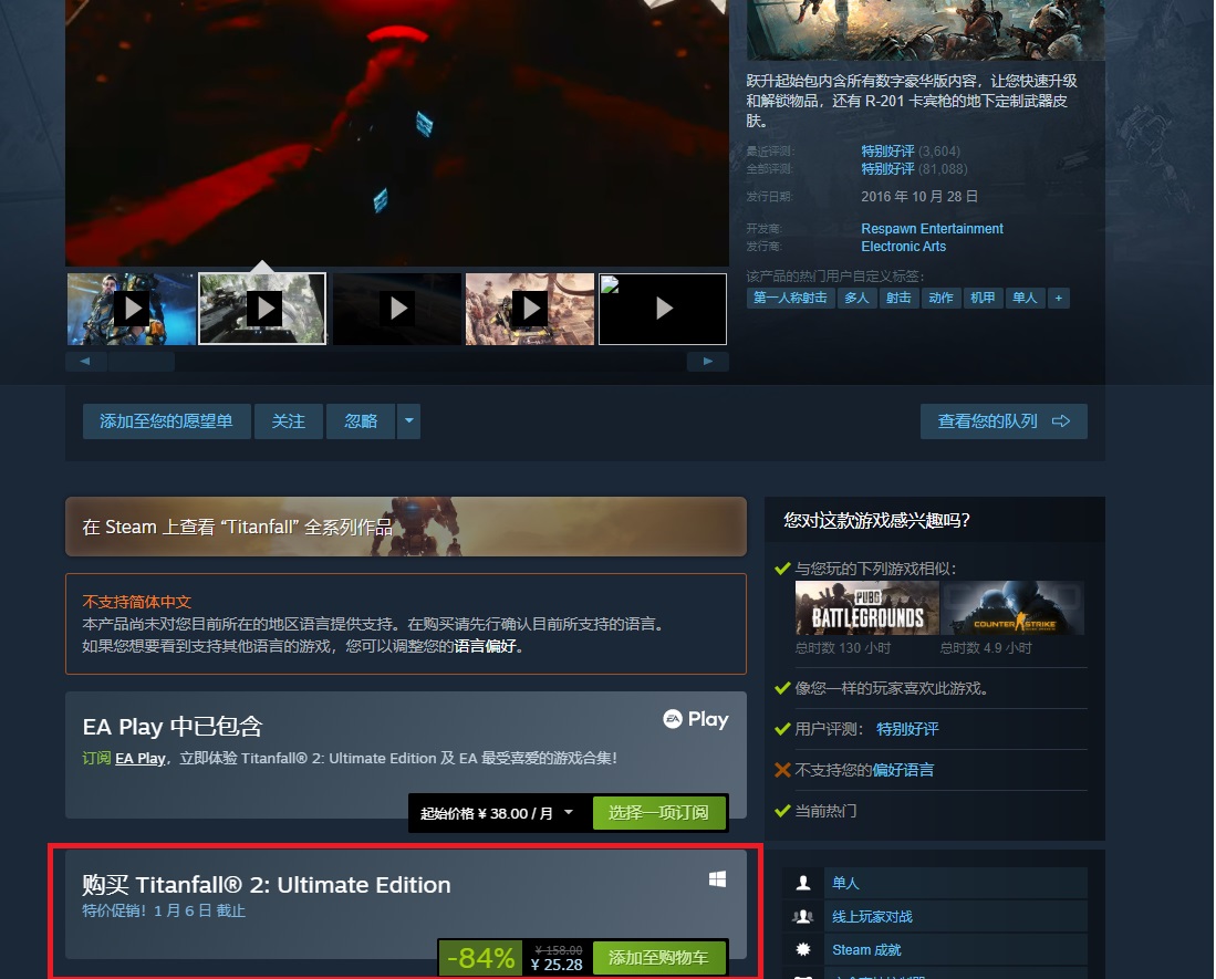 目前購買《泰坦隕落2》,推薦玩家購買終極版,目前steam售價僅為25元,比較值得入手,價格很適合,而且終極版游戲會贈送全泰坦。