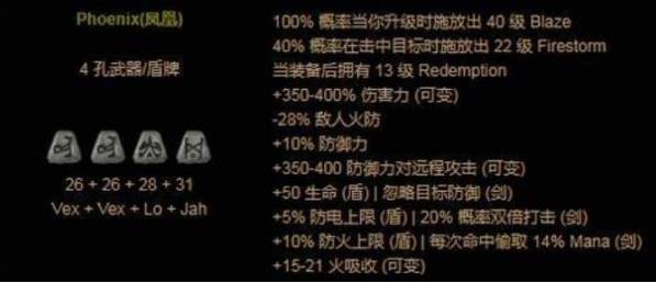 首頁 暗黑破壞神2 問答 暗黑2鳳凰盾符文之語屬性是什麼? 2022-12-28 該盾牌除主要防禦屬性外,還具備降低敵人火抗增加自身火抗的屬性,在增加火吸收的同時還提高了火防上限,並且附帶攻擊吸血效果。
