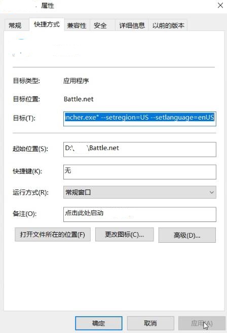 3,在目標欄"D:zhan wangBattle.netBattle.net Launcher.exe"後邊加上 --setregion=US --setlanguage=enUS,注意空格然後點擊應用