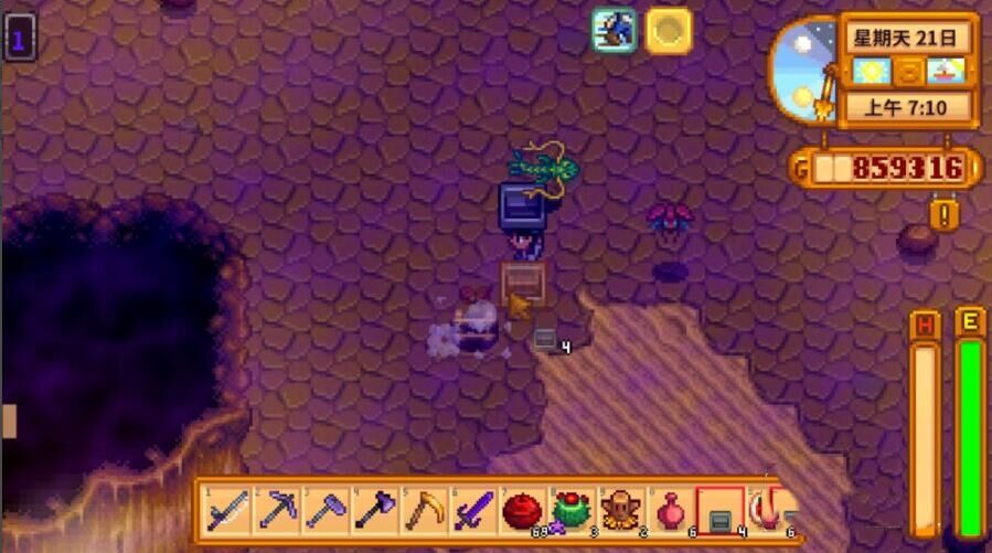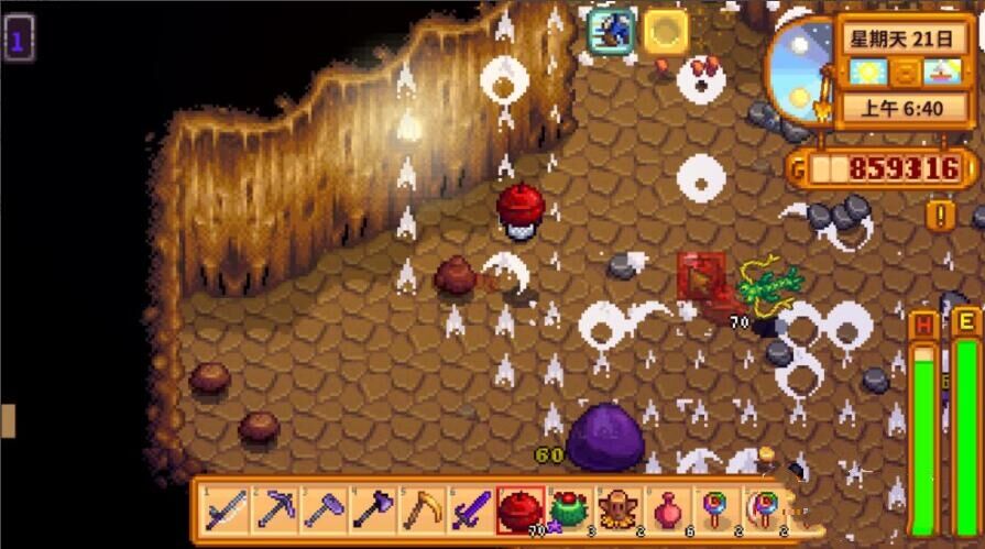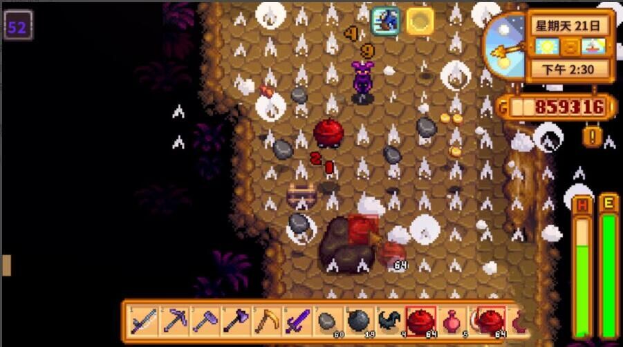 6、進入後不要用鎬子挖石頭,一個個挖時間根本不夠,想用最短時間下到100層只有1個方法,那就是炸石頭,挑選石頭密集的地方放炸彈,紫星運氣很容易炸出礦梯。