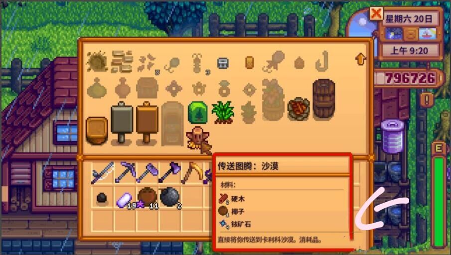 5、將背包中不要的東西放家裡,帶礦梯、炸彈和料理是必帶的,使用圖騰將自己傳送到沙漠。一旦玩家在骷髏洞中失敗,背包中的東西就會丟失幾種。