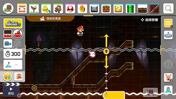 還有一點需要特別提及,在選擇了熔岩場景後,岩漿的高度就可以調整了,它的起伏高度可以根據自己的想法隨意拉高,再配合自動捲軸的速度,那種「瘋狂逃命」的關卡也就能夠輕易實現了。