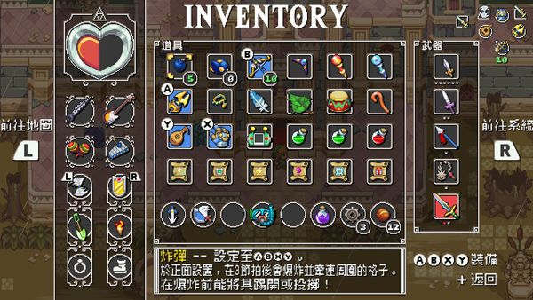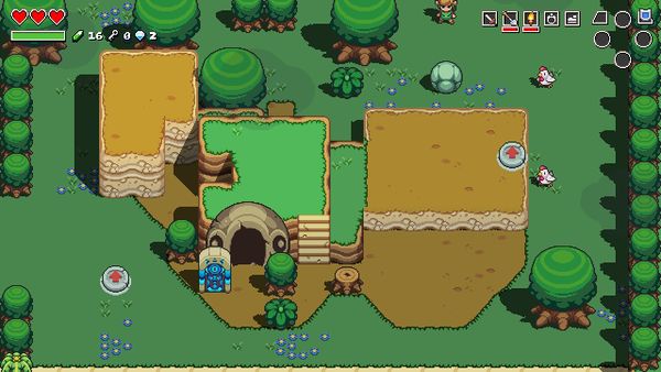 然後就是隨機地圖。本作的大地圖和地下城,少量是固定設計,大部分都是隨機生成。每開一個檔,10塊乘10塊的世界大地圖會隨機生成,地圖切換的方式和塞爾達初代接近,相當有情懷。單塊地圖下的地下城,大都是進入時隨機生成的。地形和敵人配置的隨機性讓探索的體驗不會完全一樣。雖然是隨機生成地圖,游戲主體還是不斷收集新的道具能力,和地圖元素互動,探索新場景,推進故事,塞爾達式的內容。游戲中的死亡懲罰是掉落所有盧比,鑰匙和有耐久的道具,回到記錄點,這一套下來,roguelike的感覺也比較明顯。只不過,關鍵道具基本不是用盧比買的,耐久道具殺怪掉落又很多,游戲全程不缺盧比。清完地圖獲得的鑽石又不會丟失,可以反覆刷,心的數量不會重置。死亡帶來的麻煩和挫折感並不高。一邊覺得不好走,換一邊轉轉的開放式玩法依然存在。推進游戲並不困難。沒有多少看運氣發揮的問題。