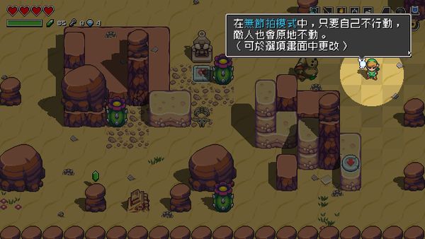 游戲內容本身,首先要說的,自然就是《節奏地牢》標志性的節拍操作了。《節奏海拉魯》有節拍模式和無節拍模式兩種。節拍模式下,主角和敵人都是在大格子地圖上,以節拍為單位,一下一下行動。與回合制不同的地方,時間一直在流動。和純動作游戲不同的地方,如果你輸入的指令不合節拍,這一次輸入就判定為失誤,行動不會發生。在關鍵時候,失誤可能會引發連鎖反應。如果連續合拍,不受傷害地戰勝敵人,就能強化魔力回復,有更好的掉落。游戲中也存在玩家不失誤才能拿到的寶箱。戰鬥結束後,節拍操作的要求會消失。清完敵人再解謎探索,會有更愉快的體驗。