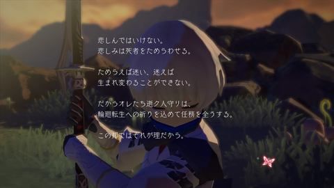 悲傷會讓死者彷徨,被留戀所束縛的死者會成為「迷途之人」。迷途之人最後會成為魔物,會在此之前拯救他們,負責拉近生者與死者兩方的就是「逝者守」。主角卡卡其在20年後選擇走上逝者守之路,但因為物語各處會出現主角淡淡訴說的獨白,讓人更加感覺到他的使命感和近乎達觀的深切悲哀。