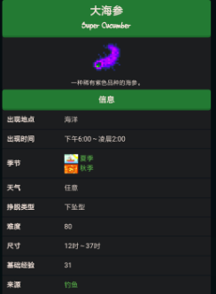 星露穀物語游戲中的紫色大海參只有在小鎮南邊海洋的碼頭可以釣到,夏秋兩季的下午6:00到凌晨2:00才能釣到。