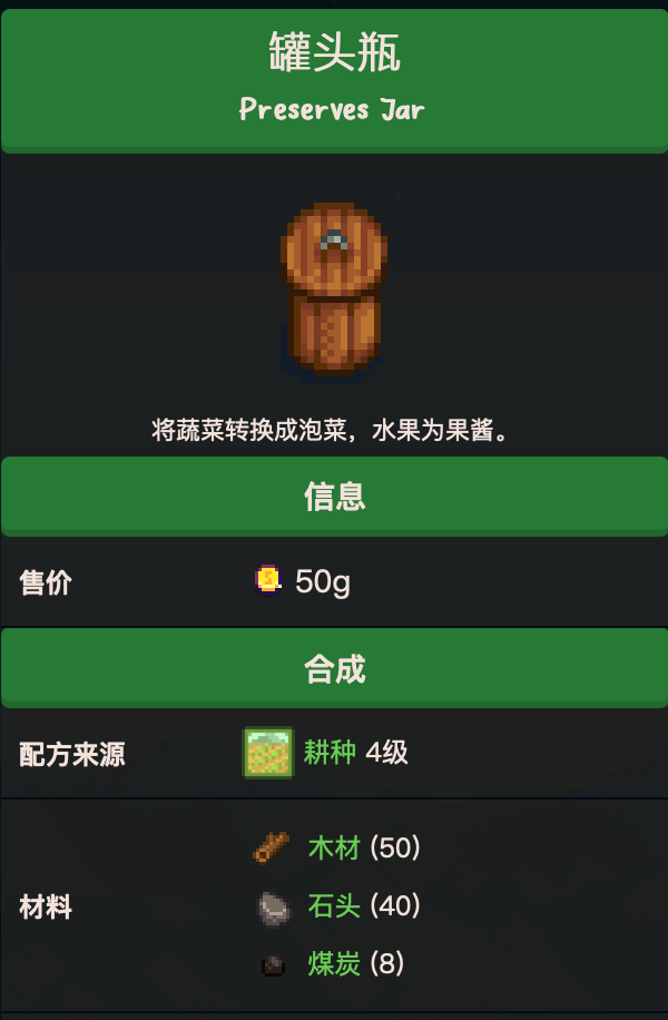 2、建造罐頭瓶需要准備一定數量多木材、石頭、煤炭,該配方於耕種技能達到4級獲得。