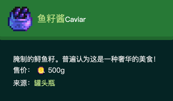 1、魚籽醬(Caviar)在游戲星露穀物語里是一種工匠物品,玩家將鱘魚魚籽放入罐頭瓶即可獲得魚籽醬(其他的魚類放入之後只會從魚籽轉化成腌制的魚籽)。
