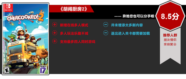 總的來說,《胡鬧廚房2》是一款合格的聚會游戲,其保留了前作的熱鬧和歡樂,游戲節奏緊湊,玩法簡單容易上手,講究配合,非常適合調節氣氛和增進朋友和情侶感情。當然,也有可能讓親密的兩人反目成仇,喜歡前作的玩家可以考慮購買本作。