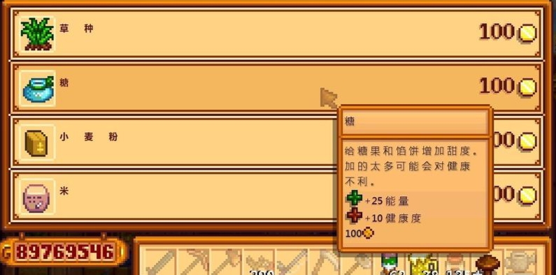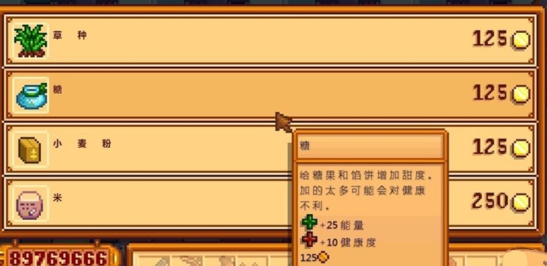 首頁 星露穀物語 問答 星露谷糖怎麼獲得? 2023-01-02 1.第一個獲得糖的方法是去鎮上的種子店。與店主對話,彈出交易窗口,用滾軸往下滑動,就找到糖了,點擊購買即可。2.第二個方法是去位於雜貨店右邊的約亞超市。與售貨員交談,彈出交易畫面,用滾軸往下滑動,就找到糖了,點擊購買即可。