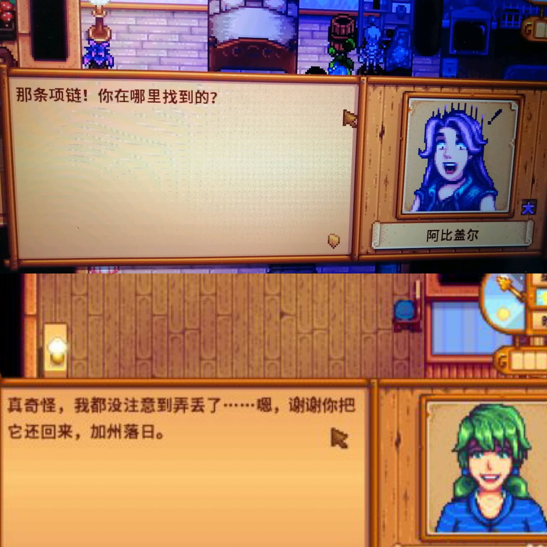 首頁 星露穀物語 問答 星露谷澡堂附近的項鏈給誰? 2023-01-02 星露穀物語游戲中,找到澡堂附近的項鏈後,我們將項鏈送給阿比蓋爾或卡洛琳,會觸發劇情,贈送方法和平時給予禮物一樣。送給不同NPC,可以得到不同的有趣對話。但是對故事劇情不會有影響(因為卡洛琳是阿比蓋爾的母親),看先找到誰就可以了。