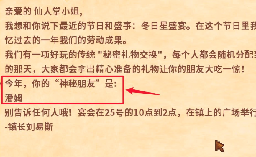 首頁 星露穀物語 問答 星露穀物語冬日星盛宴怎麼送禮? 2023-01-02 1、首先我們進入游戲,點擊農舍郵箱查看信件。2、找到關於冬日星的信件,查看好友是誰。3、冬日星節日當天找到這名好友。4、和好友聊天點擊是選項即可送禮。