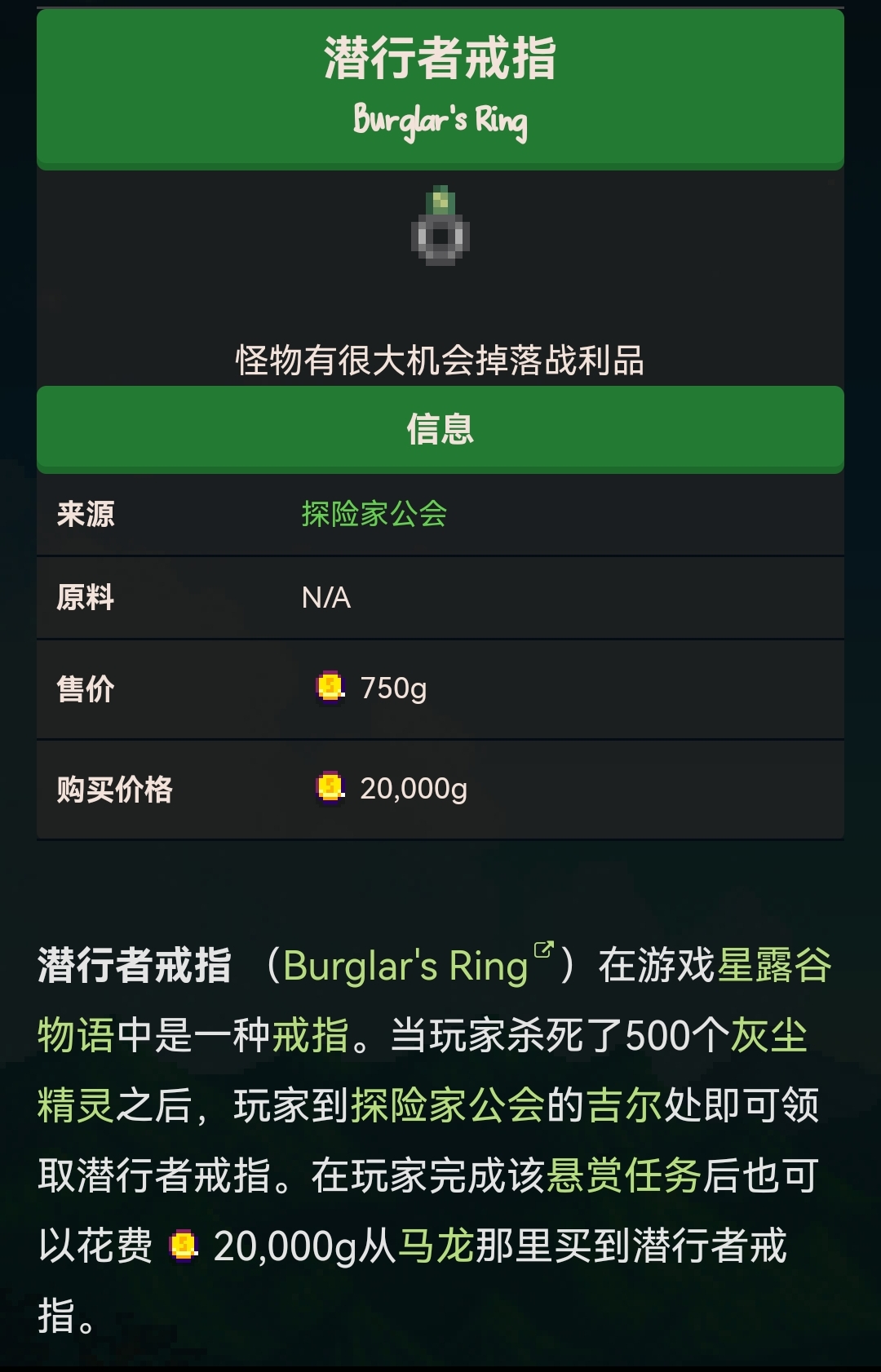 潛行者戒指 (Burglar's Ring)在游戲星露穀物語中是一種戒指。當玩家殺死了500個灰塵精靈之後,玩家到探險家公會的吉爾處即可領取潛行者戒指。在玩家完成該懸賞任務後也可以花費Coin Icon20,000金從馬龍那裡買到潛行者戒指。