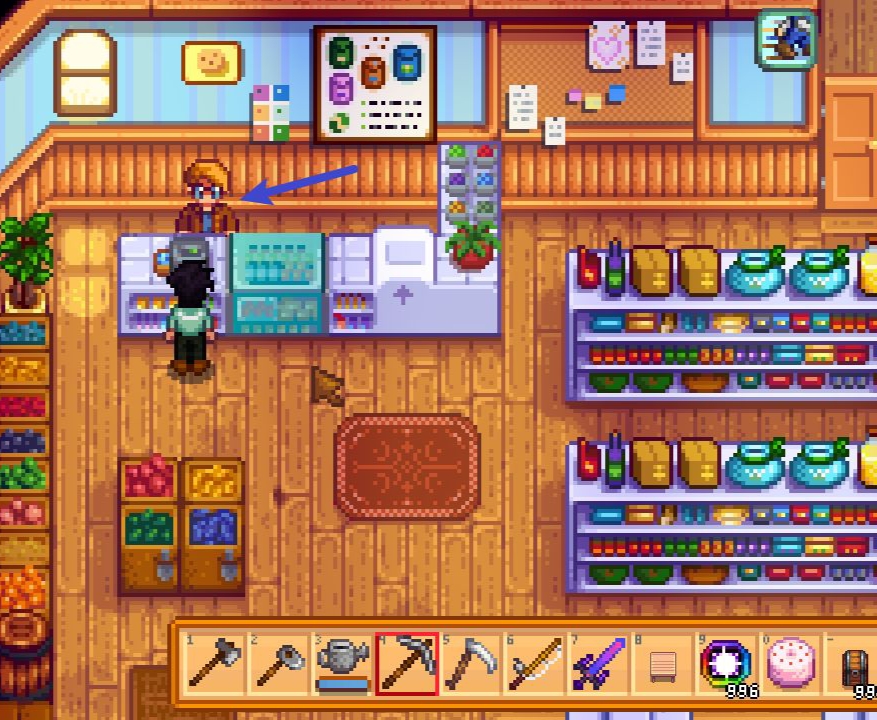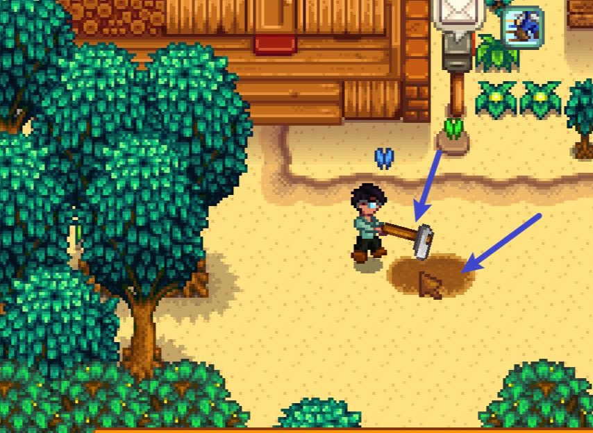 3.回到農場後,拿出鋤頭在地面上挖坑。