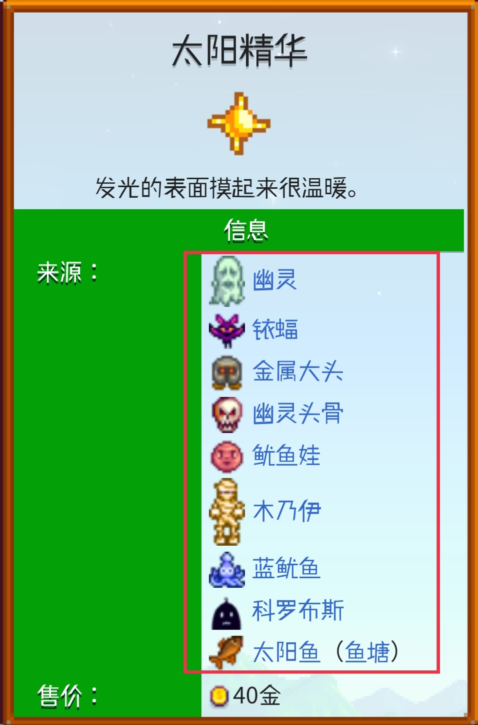 首頁 星露穀物語 問答 星露穀物語太陽精華怎麼刷? 2023-01-02 太陽精華是一種怪物戰利品,可在殺死幽靈、銥蝠、金屬大頭、幽靈頭骨、魷魚娃、木乃伊和藍魷魚時有概率獲得。科羅布斯每天會出售10個太陽精華,單價為80金 。