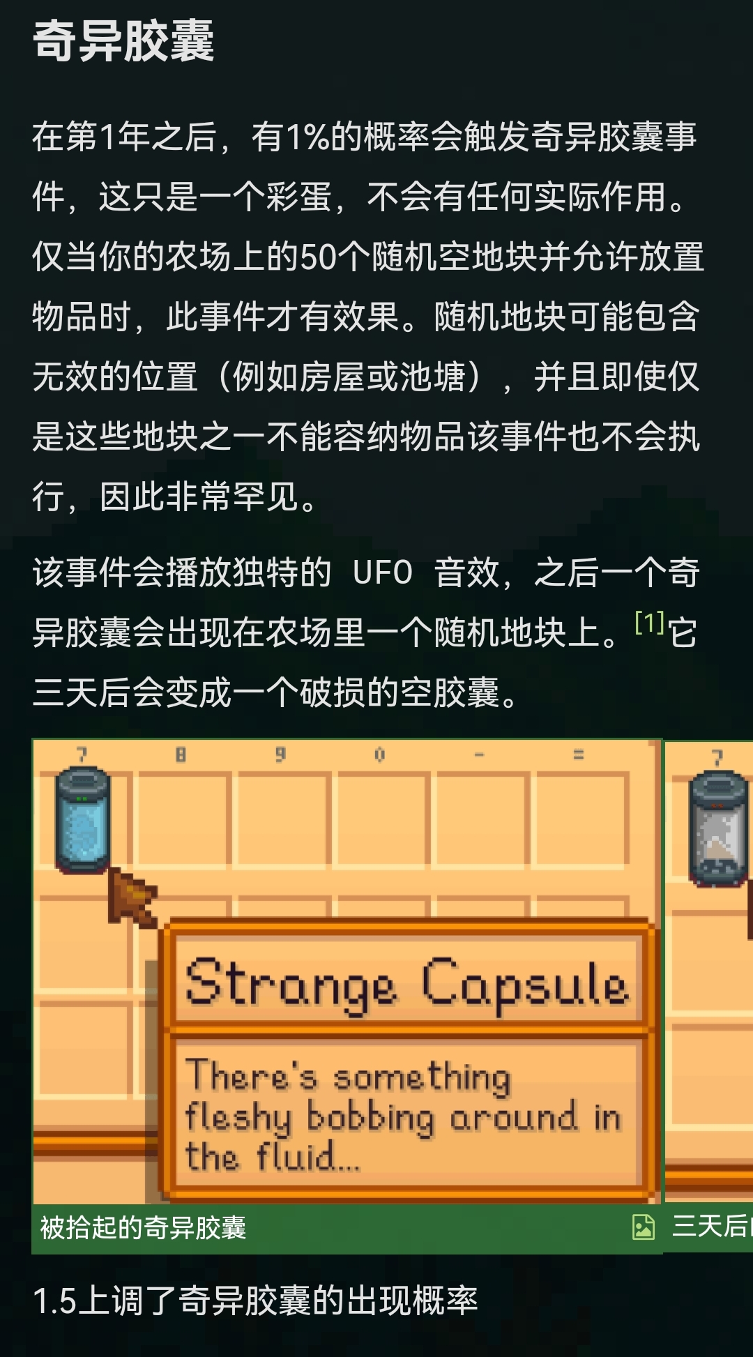 首頁 星露穀物語 問答 星露谷外星人膠囊有什麼用? 2023-01-03 外星人膠囊並沒有任何作用,在奇異膠囊事件當中會生成一個外星人膠囊在三天之後外星人膠囊就會變成一個破損的空膠囊,它並不具備任何實際的作用。