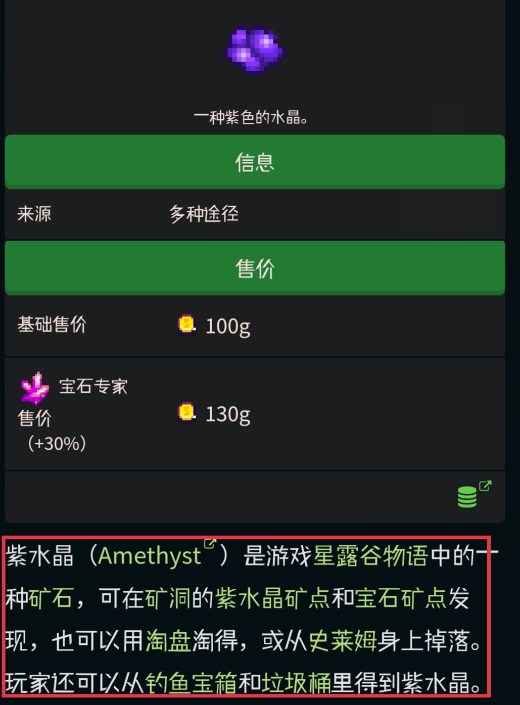 首頁 星露穀物語 問答 星露谷紫水晶在哪? 2023-01-03 在星露穀物語這款游戲中,紫水晶在礦洞的紫水晶礦點和寶石礦點,也能用淘盤淘到,紫水晶也會從史萊姆身上掉落。玩家還可以從釣魚寶箱和垃圾桶里得到紫水晶。