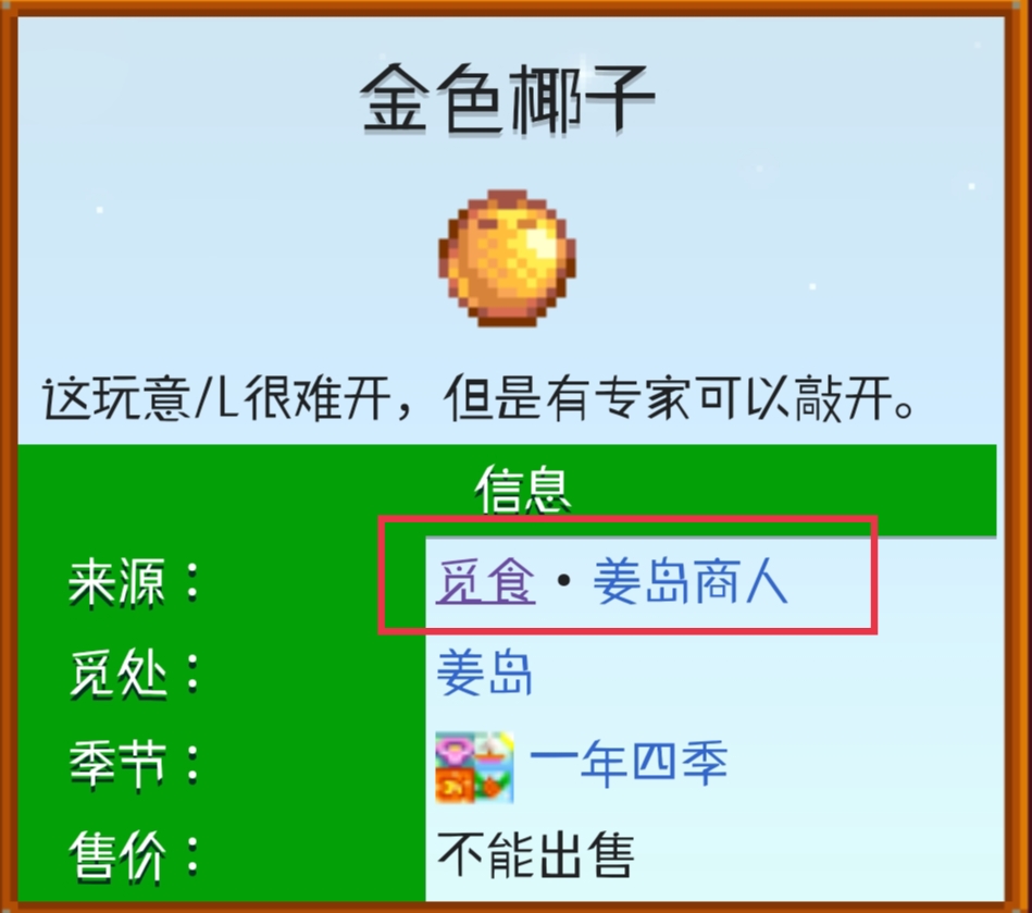 游戲中的金色椰子可在姜島的各地找到,挖掘遠古斑點甚至是搖晃棕櫚樹都有可能獲得。也可以找姜島商人,用10個椰子交換獲得一個金色椰子。