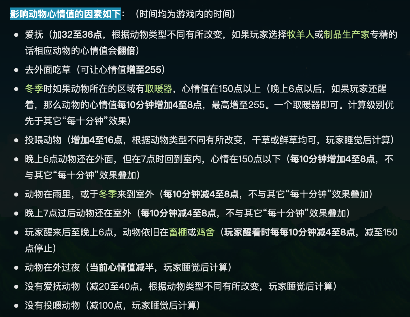 星露谷游戲中養的雞之所以不開心,跟它的心情值有關,使動物心情值下降的行為主要有:沒有愛撫動物、沒有投喂動物、讓動物在外過夜(或者是晚上7點之後動物還在室外)、下雨天/冬天動物在室外、白天動物始終呆在室內(除了下雨天)也會降低心情值。