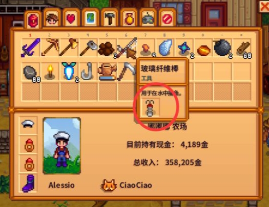 在星露穀物語這款游戲中,使用玻璃纖維棒釣魚,只要將需要的魚餌或是魚鉤左擊點中,再右擊魚竿就可以將魚餌或魚鉤裝在魚竿上。