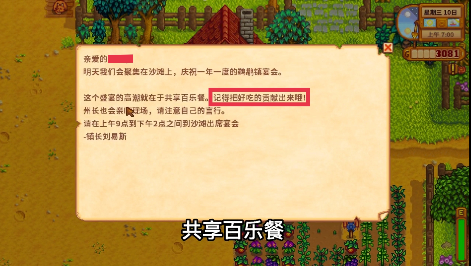 首頁 星露穀物語 問答 星露穀物語百樂宴放什麼? 2023-01-04 1、在發給玩家參加百樂宴的邀請中,只是請玩家將好吃的貢獻出來,並未表明什麼食材不可以,什麼食材可以。2、進入百樂宴後,玩家點擊中間的缸就可以加食材,食材是不受限制的。