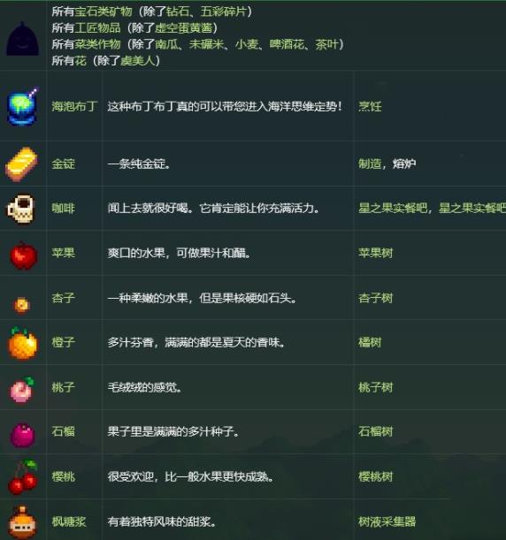 海泡布丁、金錠、咖啡、蘋果、杏子、橙子、桃子、石榴、櫻桃、楓糖漿、所有寶石類礦物(除了鑽石、五彩碎片)、所有工匠物品(除了虛空蛋黃醬)、所有菜類作物(除了南瓜、未碾米、小麥、啤酒花、茶葉)、所有花(除了虞美人)。