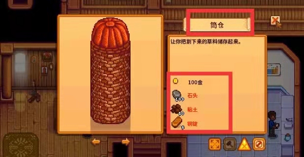 首頁 星露穀物語 問答 星露穀物語筒倉建造條件是什麼? 2023-01-04 筒倉建造條件介紹如下:在游戲《星露穀物語》中,筒倉是游戲中的農場建築,需要100g木材、500石頭以及10個黏土然後在木匠的商店裡面找羅賓建造,建造耗時2天,可以用來盛放乾草,並允許玩家通過收割草獲得乾草。