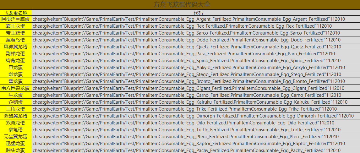 方舟游戲中目前有20種飛龍蛋,每種飛龍蛋都可以孵化出小飛龍,並且每個飛龍蛋都有對應的代碼,下圖為目前版本每種飛龍蛋及其代碼。