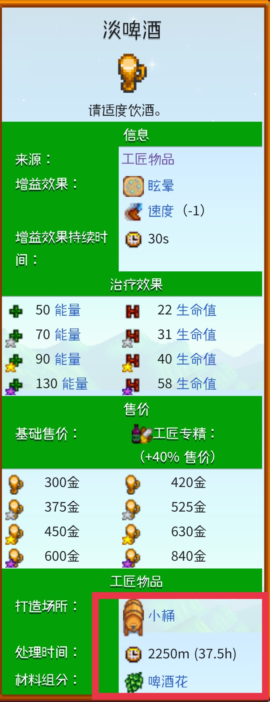 首頁 星露穀物語 問答 星露谷淡啤酒在哪裡賣? 2023-01-05 淡啤酒無法在通常的地方購買,有小幾率可以在旅行貨車購買,但是價格相當的貴。耕種到達8級之後,可以解鎖小桶,在裡面可以自己釀造淡啤酒。然後需要啤酒花才能夠釀造淡啤酒,啤酒花可以在夏天的時候種植。
