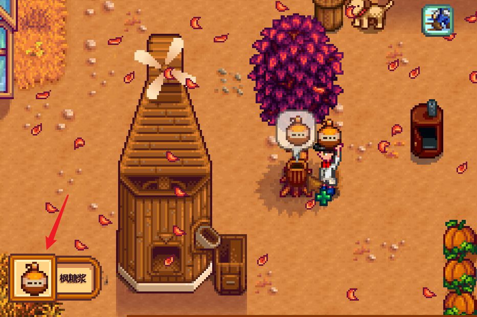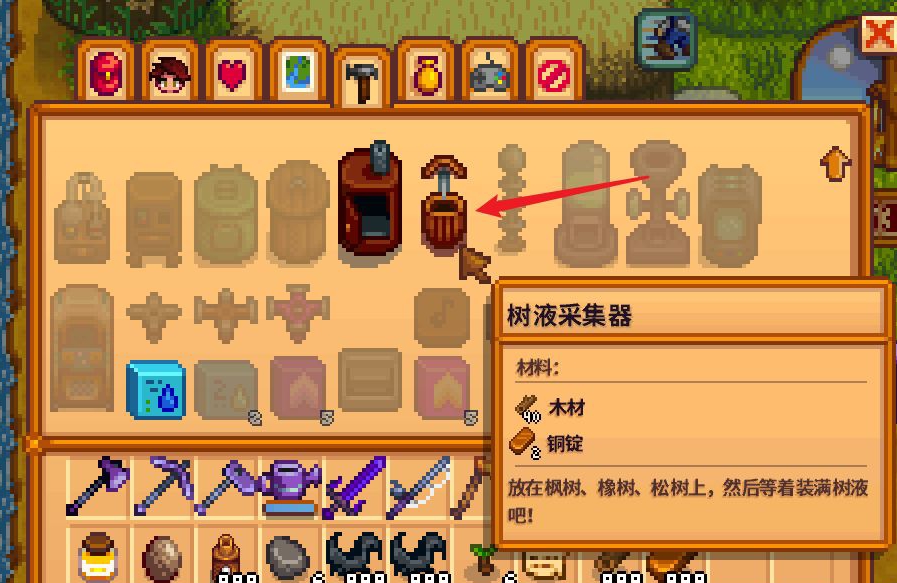 首頁 星露穀物語 問答 星露谷楓糖漿怎麼拿? 2023-01-05 1.首先進入游戲後,在背包面板點擊建造按鈕,然後選擇用銅錠和木材製作樹液採集器。2.接著在地圖上選中任意一棵楓樹就行,再將樹液採集器懸掛在楓樹的上面。3.最後放置7到8天就可以獲得楓糖漿,到時候只要去楓樹那裡採集即可。
