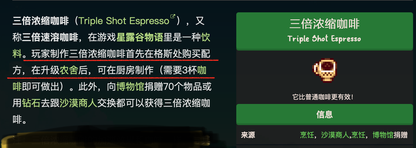 首頁 星露穀物語 問答 星露穀物語三倍濃縮咖啡配方怎麼獲得? 2023-01-06 玩家想要製作三倍濃縮咖啡,首先需要在格斯處購買配方,格斯是鵜鶘鎮上星之果實餐吧的擁有者,也在酒吧工作。獲得配方後升級農舍,可在廚房製作獲得。