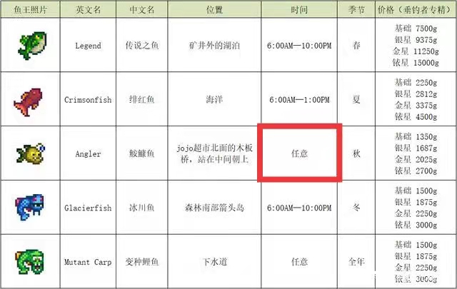 首頁 星露穀物語 問答 星露穀物語秋季魚王什麼時候出現? 2023-01-06 秋季魚王時間介紹:在《星露穀物語》這款游戲中,秋季魚王是在秋季任意時間中喬家超市旁邊的那條河裡面釣,當玩家到達喬家超市旁邊的那條河的河岸後,沿著河邊往上走,過河找到一個籬笆樁,籬笆樁的下方就是釣秋季魚王的位置。