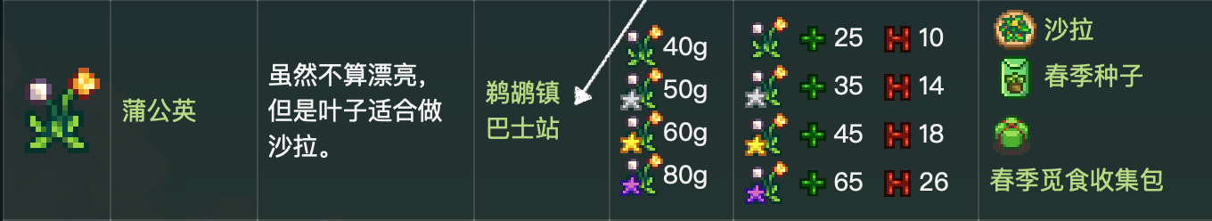 首頁 星露穀物語 問答 星露谷蒲公英在哪裡最容易找到? 2023-01-06 蒲公英(Dandelion)是由春季種子生長而成的。春季時,可以在鵜鶘鎮里通過覓食找到。或在花舞節找皮埃爾購買。主要跟季節有關,春季時在鵜鶘鎮和巴士站都會有比較多的蒲公英。