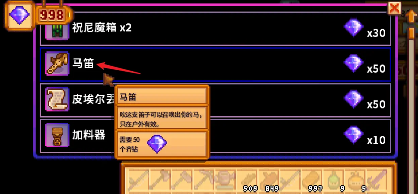 首頁 星露穀物語 問答 星露谷馬笛怎麼獲得? 2023-01-06 1、收集金核桃在姜島上收集100個黃金核桃。2、進入核桃房條件滿足後,進入齊先生的核桃房。3、打開商店點擊打開核桃房右側的齊鑽商店。4、購買馬笛消耗50個齊鑽購買馬笛。