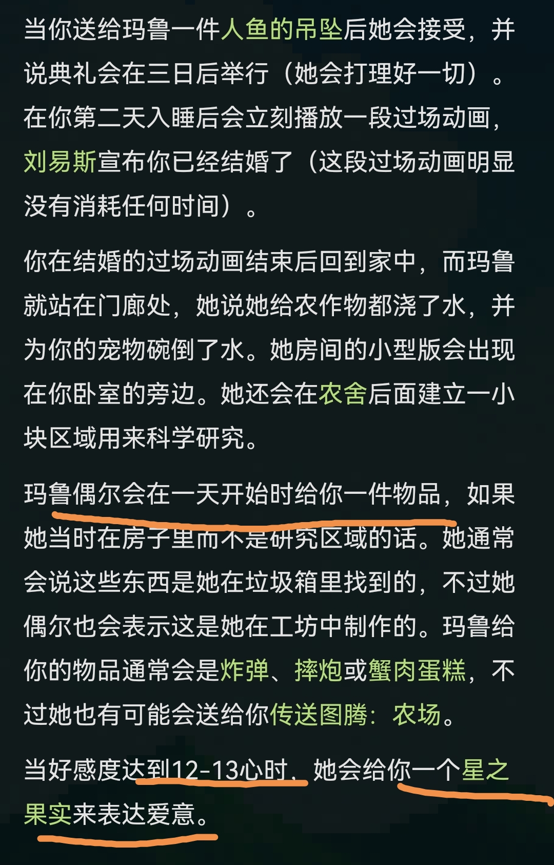 首頁 星露穀物語 問答 星露穀物語和小黑結婚有什麼好處? 2023-01-06 和小黑結婚之後,你有可能在每一天開始的時候,她會給你一樣物品,這個物品通常是炸彈,摔炮或者蟹肉蛋糕,也有可能是農場的傳送圖騰,不過概率比較小,在好感度達到12~13星時,她會給你一個心之果實來表達愛意。