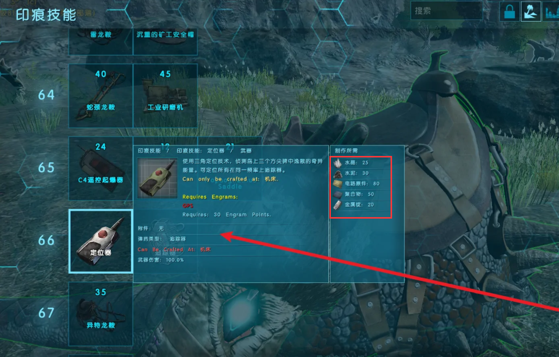 給恐龍安裝上定位器,這樣就可以隨時定位恐龍的位置。定位器是游戲後期才會出現的道具,等級達到66級後方能學習製作,所需材料如下。