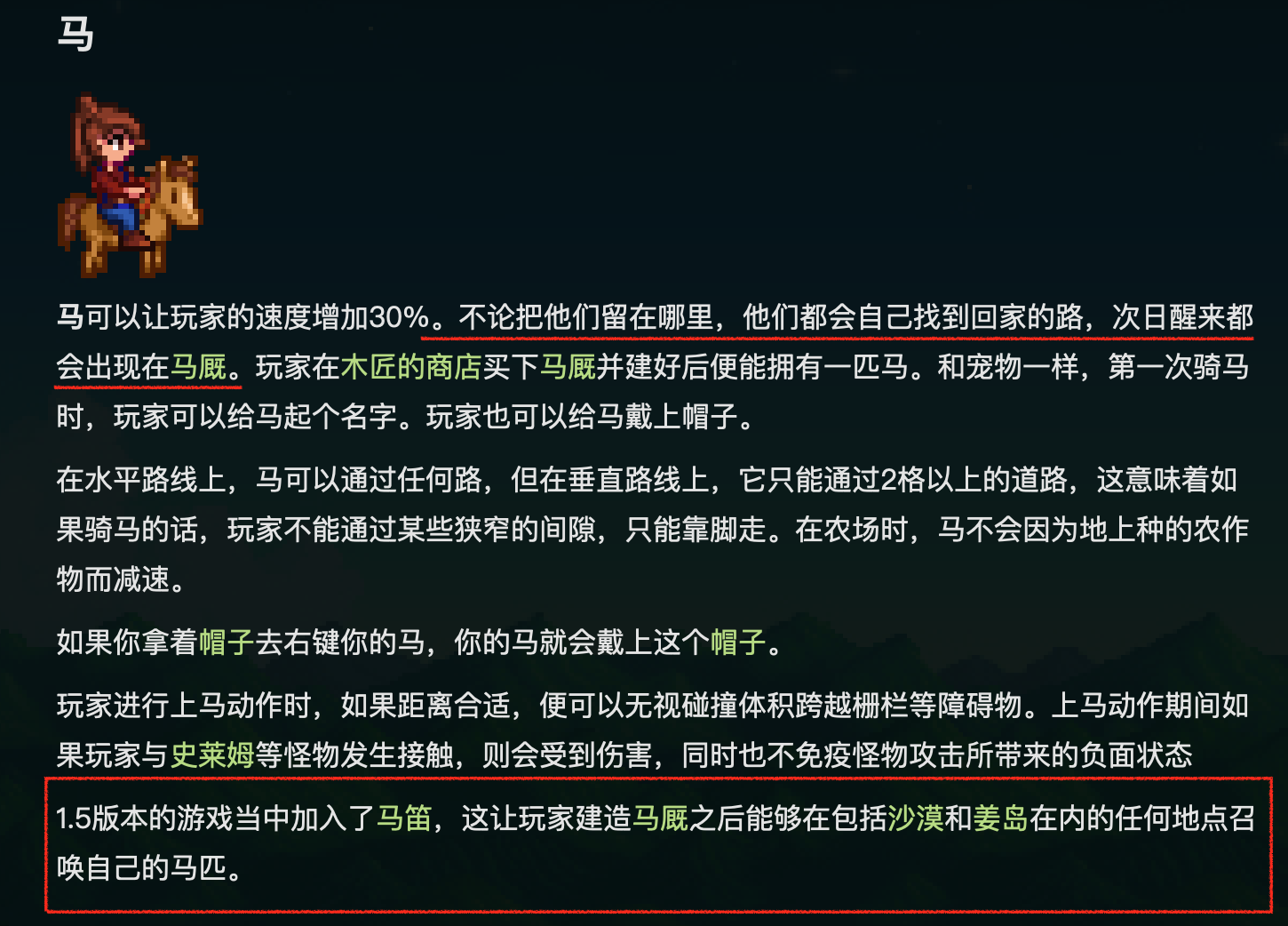 首頁 星露穀物語 問答 星露穀物語怎麼叫馬過來? 2023-01-08 1、玩家可以使用馬笛在戶外任何地點(包括沙漠,姜島)召喚自己的馬。玩家需要建造馬廄後才能使用馬笛。玩家可以在齊鑽商店購買馬笛。2、馬是會自己回家的,無論將他們留在哪裡,他們都會自己找到回家的路,次日醒來都會出現在馬廄。