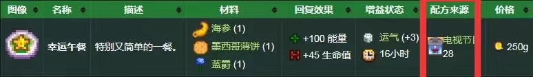 首頁 星露穀物語 問答 星露谷幸運午餐食譜怎麼獲得? 2023-01-10 幸運午餐食譜獲得方法介紹:在游戲《星露穀物語》中,幸運午餐食譜獲得方法為玩家收聽電視節目解鎖菜單,所需材料為海參、墨西哥薄餅和藍爵,玩家享用完可獲得100點的能量和45點的生命值,同時還會使玩家運氣值加3點,持續時間為16小時。