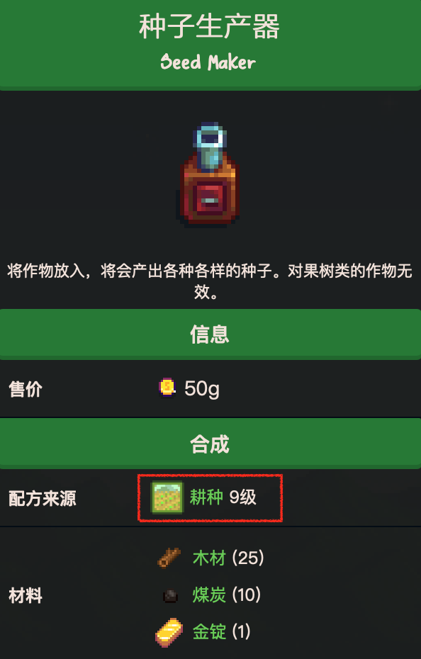 首頁 星露穀物語 問答 星露穀物語種子製造機怎麼解鎖? 2023-01-10 種子製造機也叫種子生產器,它的配方需要玩家的耕種等級到了9級之後才能獲得,那時候我們才可能製作種子製造機。製造需要25個木材,10個煤炭和1個金錠,滿足條件後按E鍵打開背包製作,製作種子製造機並放入物品欄。