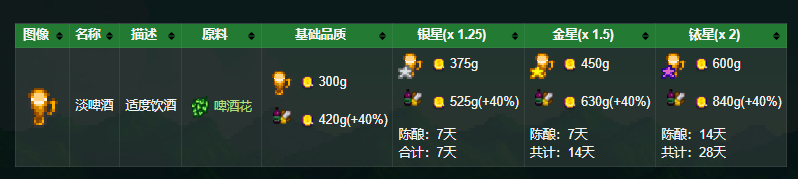首頁 星露穀物語 問答 星露谷啤酒花釀酒要多久? 2023-01-11 在星露穀物語中,啤酒花釀成淡啤酒製作時間是1-2天。但如果要有星級的話,時間會稍微長點,例如銀星金星級別的需要陳釀7天,銥星級別的更長,陳釀需要14天。
