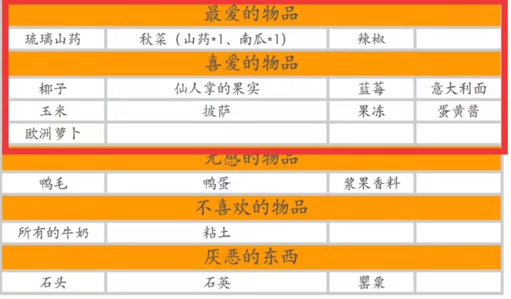 首頁 星露穀物語 問答 星露穀物語路易斯喜歡什麼? 2023-01-11 路易斯喜歡介紹如下:在游戲《星露穀物語》中,路易斯最愛的是琉璃山葯、秋菜、辣椒,喜歡的是椰子、仙人掌的果實、藍莓、義大利面、玉米、披薩、果凍、蛋黃醬、歐洲蘿卜。