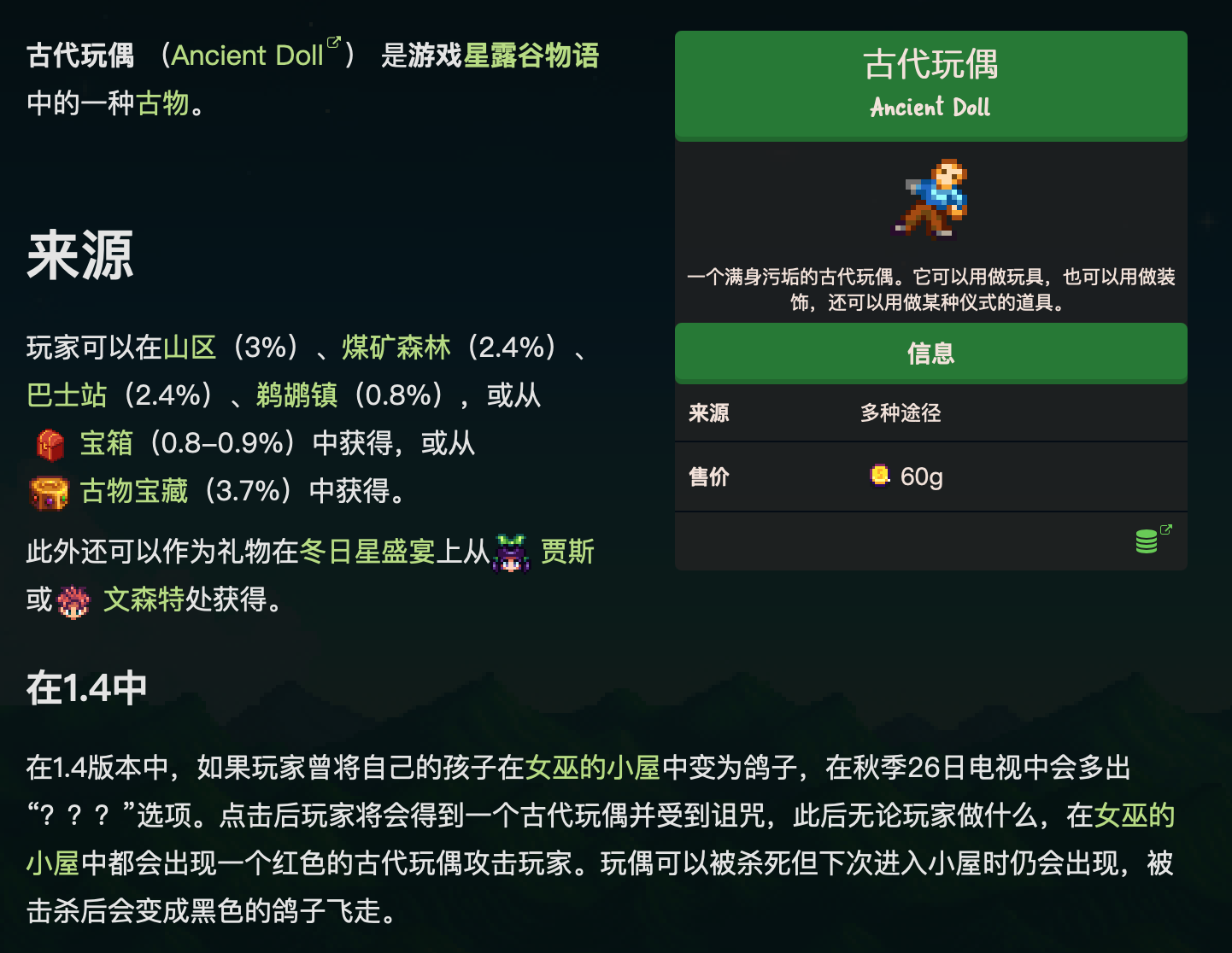 首頁 星露穀物語 問答 星露穀物語古代玩偶有什麼用? 2023-01-11 古代玩偶是游戲中的一種古物。它是一個滿身污垢的古代玩偶。它可以用做玩具,也可以用做裝飾,還可以用做某種儀式的道具。古物都可以捐贈給博物館,另外這個玩偶在1.4版本中玩家會被詛咒,還會有一些製造恐怖氣氛的作用。