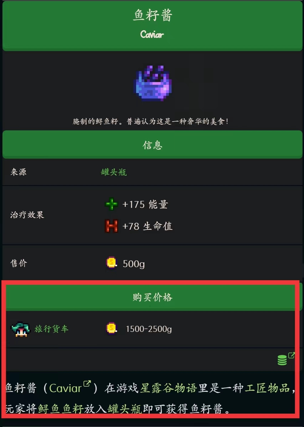 首頁 星露穀物語 問答 星露穀物語魚籽醬怎麼得到? 2023-01-11 在游戲《星露穀物語》中,魚籽醬是一種工匠物品,玩家將鱘魚魚籽放入罐頭瓶即可獲得魚籽醬,或者花費1500-2500g在旅行貨車購買獲得。