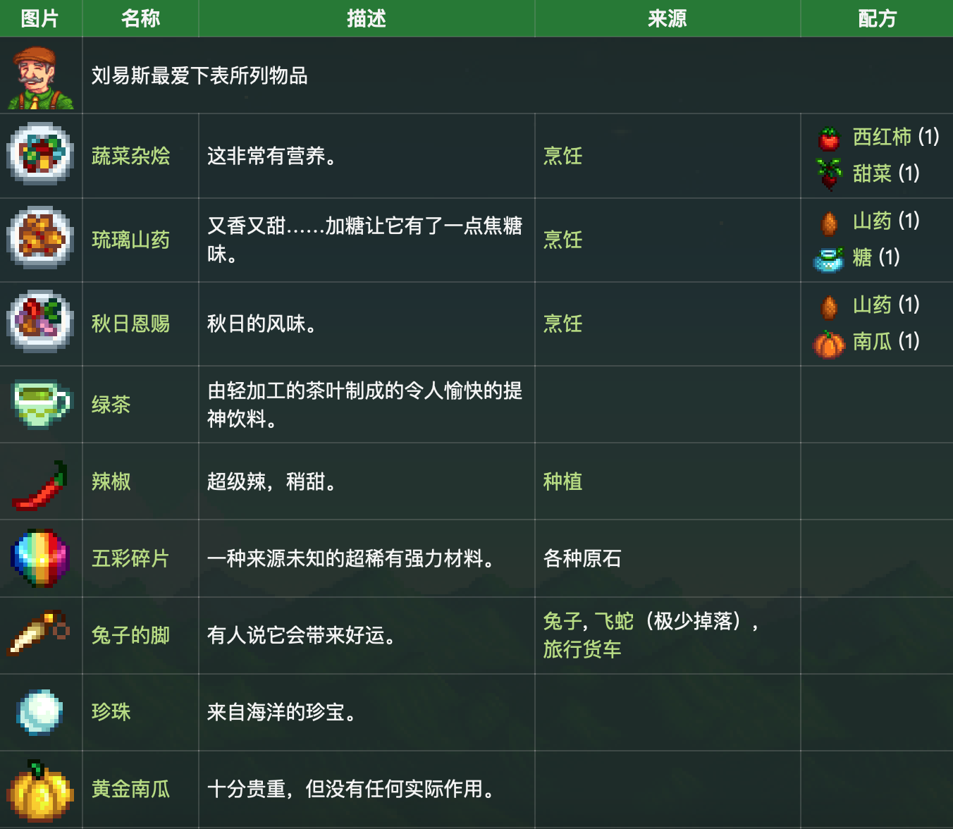 首頁 星露穀物語 問答 星露谷劉易斯喜好什麼? 2023-01-11 劉易斯是游戲星露穀物語中鵜鶘鎮的鎮長。我們每周最多可以送給劉易斯最多兩件禮物(加上在他的生日可以額外送出一件)。劉易斯最愛的物品有:蔬菜雜燴、玻璃山葯、秋日恩賜、綠茶、辣椒、五彩碎片、兔子的腳、珍珠、黃金南瓜等。