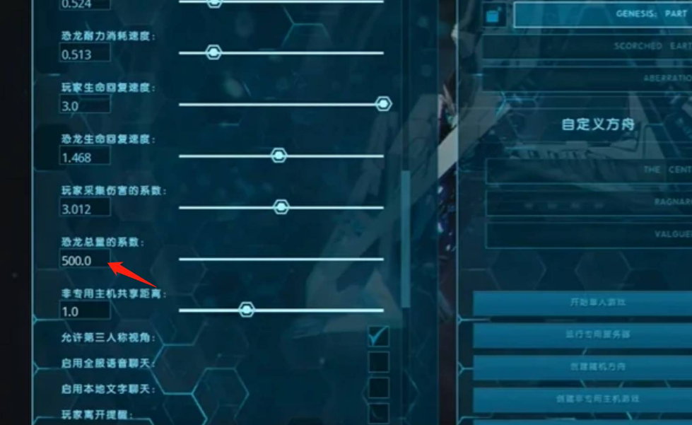 2、然後打開游戲開始設置界面,在最左側通用一欄往下找,找到【恐龍總量的系數】選項。將恐龍總量的系數改為500,即可將龍的刷新總量增加五百倍,設置完成後,返回遊戲即可。