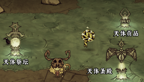 【饑荒】饑荒月島上會有天體裂縫,在島上找到3個誘人的結構並開采可以得到天體祭壇的零件,按照正確的順序插入天體裂隙中就可以獲得祭壇。