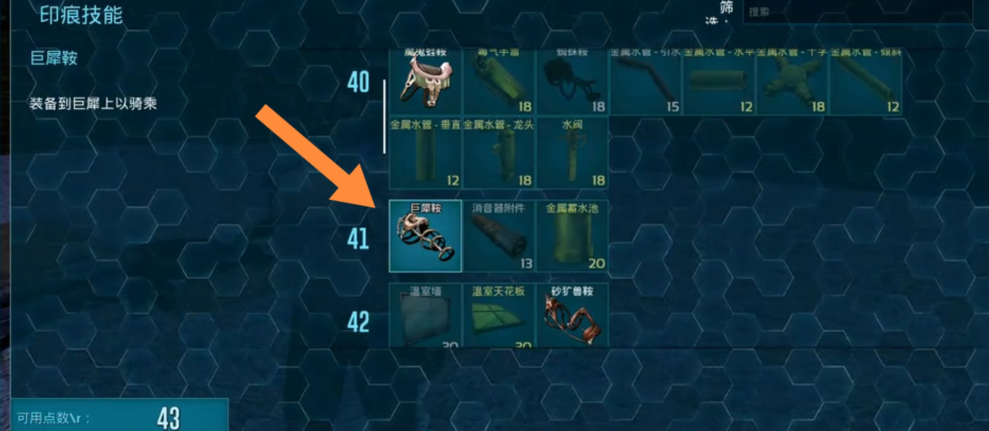 首頁 方舟:生存進化 問答 方舟巨犀鞍多少級解鎖? 2023-01-23 方舟巨犀鞍要41級才可以解鎖,如下圖所示,玩家在游戲的印痕技能界面可以找到這個巨犀鞍的解鎖等級,巨犀鞍技能解鎖後玩家就可以在製作欄製作巨犀鞍了,之後就有機會乘騎巨犀了。